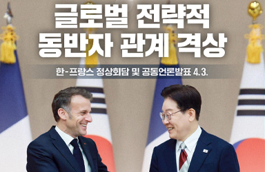 한·프랑스 수교 140주년 새로운 140년의 미래로 ■ 글로벌 전략적 동반자 관계 격상– 한-프랑스 정상회담 및 공동언론발표(2026.4.3.) · 호르무즈 해협 안전 수송로 확보 협력 · 2030년 교역 200억 달러 달성 목표 · AI, 반도체, 양자, 핵심광물, 원전, 우주, 방산, 문화 등 협력 확대 ☞ 정책뉴스로 자세히 보기 정책브리핑의 정책뉴스자료는 「공공누리 제4유형:출처표시+상업적 이용금지+변경금지」의 조건에 따라 자유롭게 이용이 […]
